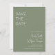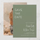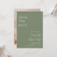 Une carte de Save the Date moderne et bohème qui présente une palette de couleurs vert sauge et un design minimaliste.