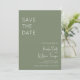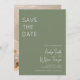 Une carte de Save the Date moderne et bohème avec une palette de couleurs vert sauge et un design minimaliste.