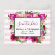 Une carte de faire-part de mariage avec un bouquet floral composé de roses rose clair et de pavots rose foncé avec beaucoup de feuilles vertes luxuriantes. Un cadre rectangle superposé pour mettre votre texte personnalisé à l'intérieur. Le fond est un motif rayé rose pastel doux. Le verso de la carte postale contient également toutes vos informations personnalisées.
