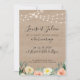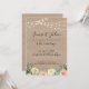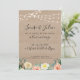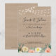Faire part de mariage champêtre et vintage, inspiration guinguette. Avec guirlandes lumineuses, fleurs et fond bois.