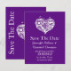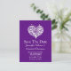 Élégante carte de mariage violet 'Save the Date', avec de jolies illustrations d'un cœur orné réalisé avec des fioritures. Le texte blanc est prêt à être personnalisé pour votre annonce excitante. Idéal pour les invités hors de la ville qui ont besoin de temps supplémentaire pour planifier à l'avance.