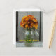 Une carte postale de faire-part de mariage d'automne avec une photo d'un pot de fleurs orange et jaunes sur un fond de bois de grange. Cherchez des invitations de mariage assorties et plus encore chez Jill's Paperie.