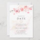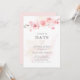 Les fleurs de cerisier rose saumon les plus douces reposent sur une branche en haut de ce faire-part de mariage moderne et minimaliste de changement de date. Un lavis aquarelle rose à peine visible ajoute une dimension. Le verso de l'invitation est également rose saumon. Le résultat est une aquarelle botanique moderne.