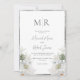 Élégante botanique de lys blancs avec fleurs d'aquarelle. Ajoutez les initiales de mariée et de mariée pour monogramme cette belle invitation. Beau cadre en faux argent embellit cette belle faire-part de mariage simple mais chic. Juste exquis.
