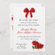Une faire-part de mariage magnifique pour la saison de Noël. Il présente un graphique d'un arc rouge en haut et deux poinsettias en bas. Tout le texte est personnalisable. Noms de mariée et de mariée faits en rouge correspondant. L'arrière a l'image de deux poinsettias plus grand.
