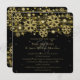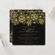 Moderne et élégant modèle de "Faire-part de mariage de vacances en or et noir" avec des flocons de neige et des lumières à paillettes dorées sur fond noir.
