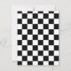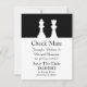 Faire-part de mariage noir et blanc annonce de date limite réalisé dans un thème de jeu d'échecs. Les silhouettes d'une pièce d'échecs blanche Reine et Roi ornent la partie supérieure noire de l'annonce, avec la partie inférieure réalisée en blanc. Le dos est réalisé dans un motif à damier noir et blanc. Le texte en noir est prêt à être personnalisé avec vos informations de mariage. Superbe annonce pour le couple aimant les échecs.