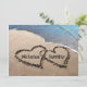 Belle photographie professionnelle originale de deux cœurs écrits ou dessinés dans le sable le long de l'eau de l'océan bleu pour signifier l'amour et la romance. Insérez facilement le nom des mariés dans les cœurs comme indiqué. Les noms exemples sont écrits dans le style de police et la couleur parfaitement assortis qui peuvent également être modifiés facilement. Mettez votre texte personnalisé et vos détails et informations au verso de l'invitation ou laissez-le vide si vous le souhaitez. Excellent concept pour les fiançailles estivales à venir, les mariages sur la plage, les anniversaires, et les invitations et annonces "save the date" pour le couple heureux.