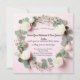 Cette conception de faire-part de mariage intemporel présente une délicate bordure florale de roses blanches, de gypsophile et de feuilles d'eucalyptus sur un fond rose pastel doux. Parfait pour les couples qui recherchent un thème de mariage classique et romantique