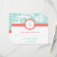 Faire-part de mariage en damas à monogramme moderne et fantaisiste en vert menthe et pêche corail Emberglow. Cartes de réponse avec RSVP en vert menthe Arcadia et pêche corail Emberglow