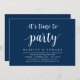 Invitation thème script rustique moderne, bleu marine (avec titre de carte : Il est temps de faire la fête). C'est parfait pour votre réception de mariage intime / fête de célébration post-mariage. Ajoutez vos détails dans une police / lettrage noir assorti.