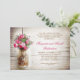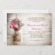 Fond en bois rustique romantique et pot de maçon avec des fleurs roses foncées faire-part de fête ou de dîner d'anniversaire de mariage. Je suggère un beau papier texturé en lin pour ce design.