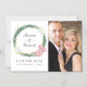 Faire-part de mariage magnétique tendance géométrique avec feuillage d'eucalyptus et roses roses blush encadré d'or géométrique.