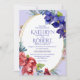 Aménagement floral aquarelle de fleurs bleues/violettes profondes complétées de fleurs rouges avec cadre ovale or. Dos violet profond avec fleurs rouges. Tous les types et couleurs sont personnalisables.