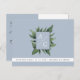 Élégante, simple, calligraphie moderne faire-part de mariage bleu poussiéreux d'annonce de carte postale, avec monogramme et feuillage rustique à l'avant.