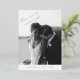 Cette simple annonce de mariage après une cérémonie intime a l'air tendance et élégante. Elle comporte des photos en noir et blanc du couple, une écriture manuscrite en feuille d'or véritable (couleurs or, argent et bronze disponibles) avec la mention "Maintenant nous sommes mariés" et les noms du couple. Cette carte de cérémonie intime recto-verso est facile à personnaliser avec les photos, les noms et les messages personnalisés des futurs mariés.