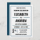 Une faire-part de mariage mariage simple et moderne. Gras, noir et blanc. Les accents de la bordure bleue et le côté arrière de l'invitation.