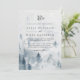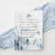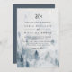 Élégante invitation de mariage hivernal, un arrière - plan d'aquarelle représentant un paysage de montagne enneigé parsemé de pins dans les nuances brumeuses de bleu et de gris. Personnalisez avec vos détails mariages en lettrage doux et doux, surmonté de votre monogramme ou de votre duogramme, accompagné d'un esperluette décoratif. Un beau choix pour des mariages d'hiver élégants en montagne ou en forêt.