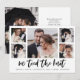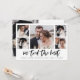 Cette simple annonce de mariage noir et blanc présente une typographie moderne et décontractée qui dit "nous avons noué le nœud", avec une grille multi-photo de cinq photos sur le devant et une autre au dos. Une façon élégante de faire savoir à vos amis et à votre famille que vous avez fait le grand saut ou que vous êtes simplement mariés.