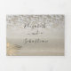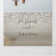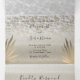Faire-part de mariage pliable triptyque simple, moderne, tropical, été 3 en 1, avec feuilles de palmier dorées, sable, vagues de l'océan, poissons dorés et photo du couple.