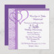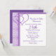 Élégante invitation de fête d'anniversaire de mariage violet et blanc réalisée en forme carrée, avec un motif damassé violet et blanc, sur la gauche et deux grands accents de cœur violet. Personnalisez le texte violet pour votre événement d'anniversaire de mariage spécial. Idéal pour les fêtes de fiançailles, les douches de mariage et les invitations de mariage également.