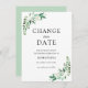 En raison d'événements récents ou de circonstances imprévues, vous pourriez devoir reporter votre mariage. Envoyez ces cartes à vos invités pour les informer d'un changement de date. Avec les mots "changer la date" en calligraphie, entourés d'un cadre de verdure et de fleurs blanches.