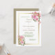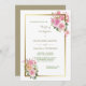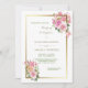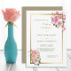 Cette élégante invitation de mariage présente des bouquets de fleurs aquarelle rose pâle et rose corail en haut à droite et en bas à gauche. Les bouquets diffèrent mais sont similaires. Les images sont posées sur un cadre doré brillant, avec un arrière - plan blanc mariage. Votre texte personnalisé est en or et vert au centre. Le dos de l'invitation est solide assorti à l'or antique. Belle, moderne et adaptée aux mariages en toute saison !