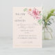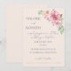 Ce faire-part de mariage au design sobre et romantique est décoré d'un arrière - plan rose pastel et d'aquarelles fleuries dans les tons rose et pêche, accentuées par des feuilles verts dans le coin supérieur droit. Le design est élégant et minimaliste, avec une palette de couleurs chaleureuse et accueillante, lui donnant une esthétique intemporelle et sophistiquée.