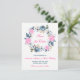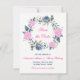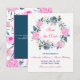 Cette belle carte de faire-part de mariage à l'aquarelle rose chaud et bleu marine indigo présente une couronne de roses, de feuilles et de branches dans des nuances de bleu, de vert, de marron et d'or. La formulation personnalisable est en bleu marine et rose et le dos comporte un motif général de fleurs et de feuilles dans les mêmes couleurs avec une zone de texte bleu marine et rose avec des lettres blanches pour que vous puissiez ajouter les informations du site Web de mariage si vous le souhaitez.
