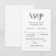 Il s'agit de la belle carte de boîtier RSVP romantique moderne (Répond), en caractères noirs, où vous pouvez modifier et mettre en forme selon vos besoins de conception, avec options de repas, sièges réservés, nombre de participants et option de demande de chanson. #TeeshaDerrick