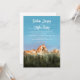 Carte de faire-part de mariage à thème de montagne rustique illustrant l'illustration d'une montagne brune avec forêt de pins. Le ciel est bleu et rose.