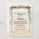 Faire-part de mariage avec guirlande de vigne florale et arche en bois flotté de plage
