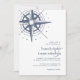 Faire-part de mariage chic côtier avec une illustration de compas dessinée à la main de style vintage en haut à gauche dans un bleu de port délavé, avec vos détails de mariage en bleu marine classique. Parfait pour les mariages sur la plage, en été ou sur le thème nautique, ces faire-part de mariage de style côtier sont imprimés sur des bandes larges bleues et blanches.
