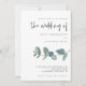 Style minimaliste moderne avec une seule branche de feuilles d'eucalyptus bleus turquoises de l'autre côté de la page du côté gauche. Le Mariage Of est aménagé dans un style d'écriture moderne et est placé au-dessus des feuilles avec vos noms, avec les autres détails en dessous. Personnalisez facilement les détails à votre façon. Un arrière - plan bleu turquoise coordonné est à l'envers. Vous pouvez modifier les couleurs de texte et d'arrière - plan à n'importe quel de vos choix pour correspondre à votre thème de couleur mariage.
