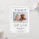 Faire-part de naissance simple avec une photo sur le devant et texte au verso annonçant la naissance d'un garçon avec un drapeau bunting bleu, un titre en calligraphie moderne et un texte noir. Cette carte de faire-part de naissance moderne est un moyen doux d'annoncer la naissance de votre nouveau-né garçon.