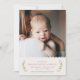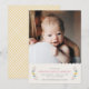 Annoncez l'arrivée de votre magnifique bébé fille avec cette simple et douce annonce de naissance. Le nom de votre bébé, ainsi que les informations de naissance, sont encadrés par une couronne de fleurs et de feuilles délicates. Le haut du design présente une jolie bordure festonnée. Il y a également un espace pour une grande photo de votre nouveau-né. Le dos de la carte présente un motif à carreaux jaune dessiné à la main... N'oubliez pas de vérifier l'enveloppe pré-adressée coordonnée.