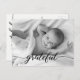 Personnalisé avec la photo du bébé sur le devant et un message spécial au dos. Ce design utilise le mot "Reconnaissant" dans une police de style lettrage manuscrit élégant pour un toucher de sophistication. Exprimez votre excitation en annonçant la naissance de votre enfant et envoyez votre gratitude en même temps. *N'hésitez pas à me contacter si vous avez besoin d'aide avec mes créations.
