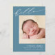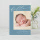 Ce faire-part de naissance élégant et moderne présente de belles calligraphies et des couleurs éditables. L'avant de la carte comprend le mot "bonjour" écrit dans un élégant script blanc contre un arrière - plan bleu. Une photo de nouveau-né carré apparaît sous le script "bonjour". Personnalisez en ajoutant votre photo préférée, le nom et les statistiques de naissance de votre bébé, et vos noms. Vous pouvez changer la couleur arrière - plan bleue sur l'avant et la couleur arrière - plan crème sur l'arrière. Des photos supplémentaires et un message personnalisé peuvent être ajoutés au dos de la carte.