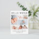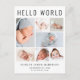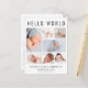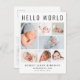 Une carte de faire-part de naissance moderne pour présenter votre nouveau-né à votre famille et à vos amis avec "Hello World" en haut en gros caractères, un collage de 7 photos et leur nom, date de naissance et statistiques de naissance dans une typographie simple. Au dos, ajoutez une autre photo et votre message personnalisé à votre famille et à vos amis.