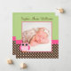 Célébrez l'arrivée de votre petite fille avec ce mignon faire-part de naissance photo de hibou. Avec une illustration de hibou sur un arrière - plan pois. Montré en rose, vert et marron. L'ÉCHANTILLON DE PHOTO N'EST PAS INCLUS. REMPLACEZ PAR VOTRE PROPRE PHOTO AVANT DE COMMANDER.