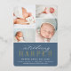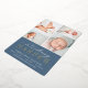Les annonces de naissance élégantes comportent quatre photos de nouveau-nés disposées dans une grille de montage sur un arrière - plan bleu poussiéreux. "Introduce [name]" apparaît sous le script de calligraphie chic et le lettrage de bloc de feuille. Personnalisez avec le nom complet du bébé, les statistiques de naissance et une signature de famille en bas. Un design simple et propre et neutre pour annoncer l'arrivée de votre petit.