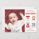 Carte faire-part de naissance moderne avec de mignons éléments infographiques et typographie moderne contre un arrière - plan blanc. Ajoutez tous vos détails sur ce modèle facile à utiliser et ornez cette carte avec la photo de votre bébé pour en faire un faire-part unique. Retournez la carte pour révéler un motif rayé rouge et blanc au dos de la carte.