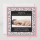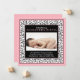 Le texte et la photo bébé sur ce chic bébé fille bébé rose, noir, et blanc floral damassé photo faire-part de naissance sont entièrement personnalisables. Pour modifier le texte et la photo, utilisez les options de personnalisation. Pour les modifications plus importantes apportées au faire-part, y compris les modifications apportées à la police, à la couleur de police, à la taille de police, à la taille de la photo et/ou à l'emplacement du texte/de la photo, utilisez l'option customiser. Les couleurs de cette faire-part de naissance florale rétro sont le noir, le blanc et le rose bébé. Ça aurait l'air super avec une photo de bébé noir et blanc aussi.
