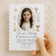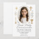 Célébrez le moment sacré de votre fille avec ce faire-part élégant de première sainte communion. Caractéristiques d'un bord dentelé délicat, des illustrations religieuses en or doux (croix, bougie, calice) et un cadre photo ovale. Parfait pour une communion traditionnelle, rustique ou moderne