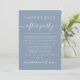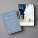 Invitation chic à une cérémonie intime ou à une annonce de mariage en bleu poussiéreux combinée à une invitation à une réception ou à une fête de célébration après le mariage. Sur le devant, "Fête de Mariage Heureux" est écrit dans un mélange de typographie blanche simple et d'un script blanc tendance avec des fioritures. Le verso présente votre photo de mariage préférée, vos prénoms et la date du mariage.