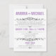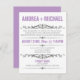Cartes d'invitation modernes conçues pour les mariages où le couple a un mariage de destination ou une cérémonie de mariage privée restreinte, et n'invite les invités qu'à la célébration de la réception. La typographie sur le devant de ces invitations est conçue avec des polices violettes et grises, et le verso est un violet uni avec un texte blanc facultatif pour les informations de RSVP potentielles.