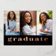Une carte moderne simple pour annoncer une remise de diplôme. Le devant présente GRADUATE en typographie feuille d'aluminium rose or. Personnalisez avec un collage de trois photos et le nom de la personne diplômée, l'année de remise de diplôme et l'établissement scolaire. Le verso comporte un modèle de typographie pour personnaliser avec votre propre message ou vous pouvez supprimer tout le texte pour laisser vierge.