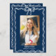 Photo de remise de diplômes moderne avec lettrage blanc gras sur fond marine. Le design présente une casquette de graduation blanche avec la phrase "Félicitations à notre diplômé". Personnalisez le nom, le nom de l'école et l'année de remise de diplôme. Pour un look plus personnalisé, changez le fond pour les couleurs de votre école. L'affiche de remise de diplôme est parfaite pour votre fête de fin d'études secondaires ou universitaires