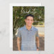 Une carte de faire-part de remise de diplôme avec une police d'écriture moderne, une photo en portrait en pleine page sur le devant avec le nom, l'année de promotion et les détails de l'école. Le verso comporte une deuxième photo avec des détails supplémentaires.
