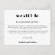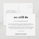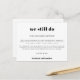 Lorsque les circonstances signifient malheureusement qu'il est nécessaire de reporter votre mariage, une carte de correspondance pratique vous permettra d'informer vos invités. Ce design typographique minimaliste en noir et blanc est entièrement personnalisable. Personnalisez facilement le texte au recto et au verso. Vous pouvez également modifier les styles et les couleurs de police, ainsi que les couleurs de fond si vous le souhaitez via l'option de personnalisation supplémentaire. Si vous avez besoin d'aide, veuillez m'envoyer un message.